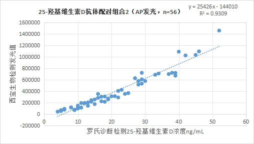 西寶生物熒光免疫層析平臺25-羥基維生素D抗體配對組合3與羅氏診斷25-羥基維生素D試劑(電化學發(fā)光法)賦值的臨床樣本相關性R2>0.90,相關性較好。