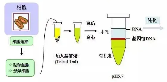 TRIzol是一種新型總RNA抽提試劑,可以直接從細(xì)胞或組織中提取總RNA。TRIzol試劑中的主要成分為異硫氰酸胍和苯酚。其中異硫氰酸胍可裂解細(xì)胞,促使核蛋白體的解離,使RNA與蛋白質(zhì)分離,并將RNA釋放到溶液中。