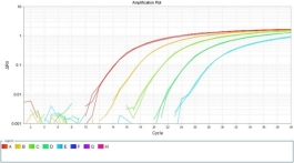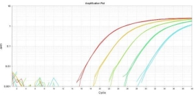 本試劑盒線性范圍為:5×10^6 - 5×10^1 copies/μL ,復(fù)孔差異小,擴(kuò)增效率高;各濃度檢測(cè)值 CV<15%。 經(jīng)過靈敏度測(cè)試,本試劑盒的定量限為 10 copies/μL。