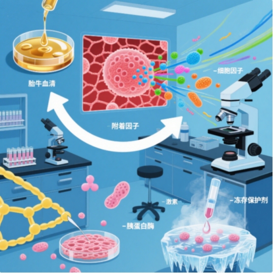 細(xì)胞培養(yǎng)技術(shù)作為現(xiàn)代生命科學(xué)研究的基礎(chǔ)工具,很大程度上取決于培養(yǎng)環(huán)境的精確控制。在標(biāo)準(zhǔn)培養(yǎng)基之外,各類補(bǔ)充劑和試劑的應(yīng)用為細(xì)胞提供了必需的營(yíng)養(yǎng)、生長(zhǎng)信號(hào)和支持,確保細(xì)胞能夠在體外環(huán)境中維持其生理功能和增殖能力。本專題將深入探討細(xì)胞培養(yǎng)中常用的各類補(bǔ)充劑和試劑,包括血清、附著因子、細(xì)胞因子、激素、細(xì)胞解離試劑以及細(xì)胞冷凍試劑,全面解析它們的功能、應(yīng)用及其在細(xì)胞培養(yǎng)中的重要性。