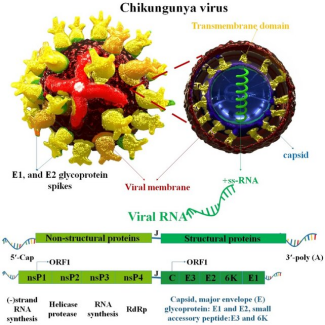 1952年在坦桑尼亞證實(shí)了基孔肯雅熱流行,并在1956年分離到病毒。該病毒是一種RNA病毒,屬于披膜病毒科甲病毒屬的Semliki forest(SF)抗原復(fù)合群。病毒直徑約70nm,有包膜,含有3個(gè)結(jié)構(gòu)蛋白(衣殼蛋白C、包膜蛋白E1和E2)和4個(gè)非結(jié)構(gòu)蛋白(nsP1、nsP2、nsP3和nsP4)。CHIKV的基因組為不分節(jié)段的正鏈RNA,長度約為11~12 kb。