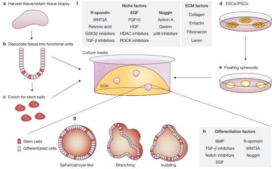 類(lèi)器官是指來(lái)源于胚胎干細(xì)胞(ESCs)、誘導(dǎo)多能干細(xì)胞(iPSCs)、新生兒或成人干細(xì)胞(ASCs),腫瘤細(xì)胞等,在體外特定的3D環(huán)境中生長(zhǎng),形成微小的細(xì)胞簇,自組織并分化成功能細(xì)胞類(lèi)型,再現(xiàn)了體內(nèi)器官的結(jié)構(gòu)和功能(因此也被稱(chēng)為“微型器官”)。