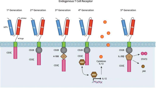 CAR結構通常也由三部分組成,即胞外抗原結合區(qū)(一般為scFv)、跨膜結構域以及胞內激活結構域。經過多年發(fā)展,CAR結構已經發(fā)展至第四第五代,CAR結構的改進主要集中在胞內共刺激結構域。有學者在第四代CAR-T的設計中添加細胞因子或趨化因子受體結構,從而增加T細胞在腫瘤組織中的浸潤,達到增強殺傷實體瘤的效果。第五代CAR在共刺激域(如CD28或4-1BB)和CD3ζ鏈之間,插入了IL-2Rβ等細胞因子受體的胞內片段,當CAR結合抗原后,該片段包含的YXXQ基序(Y代表酪氨酸)招募并激活JAK激酶和STAT蛋白,從而同時啟動T細胞活化和細胞因子驅動的增殖信號。