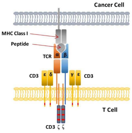 TCR-T療法依賴T細胞受體(TCR)與MHC呈遞的胞內抗原結合識別腫瘤細胞。MHC有兩種類型MHC-I與MHC-II,由人類6號染色體短臂上的人類白細胞抗原(HLA)基因座編碼,在細胞表面不同程度表達。其中,HLA-A、HLA-B及HLA-C編碼MHC-I型分子,HLA-DR、HLA-DQ、HLA-DP編碼MHC-II型分子。MHC-I負責呈遞內源性抗原信號分子,它在幾乎所有有核細胞表面表達,由一條α鏈和β球蛋白組成,其中α1和α2兩個結構域構成一個溝(Groove),這是肽段結合區(qū),其允許抗原多肽片段結合并呈遞到細胞膜表面。MHC-II負責呈遞外源性信號分子,在抗原呈遞細胞(APC)表面表達,如單核-巨噬細胞、樹突狀細胞及B細胞等。MHC-II由α和β兩條鏈組成,其中α1與β1之間形成的溝能參與抗原多肽片段的結合。
