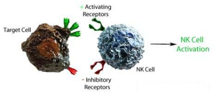 具體來講,NK細胞表面的抑制性受體(主要是抑制性殺傷性Ig樣受體KIRs和異二聚體C型凝集素受體NKG2A)可與靶細胞表面的MHC I結合并傳遞抑制信號,從而使NK細胞進入“沉默”狀態(tài);而NK細胞表面的激活性受體(主要是NCRs、NKp46、NKp30、NKp44和NKG2D)與可與細胞表面的特異性激活配體結合,從而激活NK細胞。
