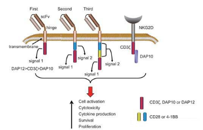 CAR-NK細胞的CAR結構通常也由三部分組成,這與CAR-T細胞療法中使用的CAR結構十分類似,事實上,目前的很多研究直接是把CAR-T中成熟的CAR結構在NK細胞系中表達來制備CAR-NK。與CAR-T中常見的CAR結構相比,CAR-NK還可以選擇NKG2D作為CAR結構的識別結構域,原因是腫瘤中普遍發(fā)生NKG2D的配體NKG2DL表達的上調。