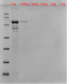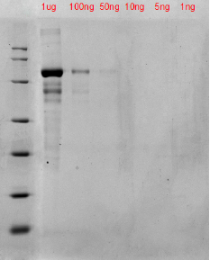 染色效果驗(yàn)證: 浸泡10min即可檢測到100ng條帶;30min可檢測到50ng條帶;經(jīng)優(yōu)化后可以檢測到20ng條帶。本品不含傳統(tǒng)PAGE凝膠染色液中使用的甲醇和乙酸,對人體無毒害、無刺激性氣味。