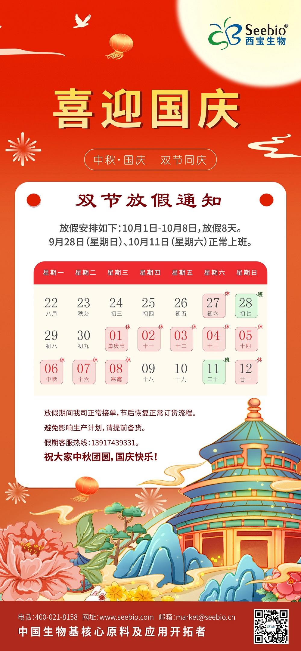 值此雙節(jié)來臨之際,西寶生物全體員工向長期支持我們的合作伙伴、客戶朋友致以最誠摯的祝福!祝愿大家在這個團圓的節(jié)日里,闔家幸福、萬事順意,度過一個輕松愉悅的假期!節(jié)后我們將以更飽滿的熱情、更專業(yè)的服務,與您繼續(xù)攜手前行,共創(chuàng)美好未來!