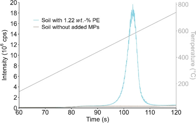 為驗(yàn)證方法在實(shí)際環(huán)境樣品中的應(yīng)用能力,研究團(tuán)隊(duì)在標(biāo)準(zhǔn)土壤LUFA 2.3中進(jìn)行PE加標(biāo)實(shí)驗(yàn)(約2 wt.%)。如圖4所示,盡管土壤本身有機(jī)碳含量(0.75%)會(huì)產(chǎn)生背景信號(hào),但在微塑料特征熱解溫度區(qū)間(440-590°C),背景信號(hào)相對穩(wěn)定,PE微塑料的13C+信號(hào)峰清晰可辨。通過基線校正和峰積分處理,測得PE在土壤中的回收率為91.2%,與純物質(zhì)測量結(jié)果相當(dāng)。