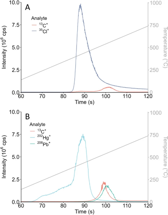 此外,研究團(tuán)隊(duì)還驗(yàn)證了方法對塑料添加劑的檢測能力。使用含汞氧化物和硬脂酸鉛的ABS標(biāo)準(zhǔn)物質(zhì)(BAM-H010)進(jìn)行測試,結(jié)果顯示汞和鉛的信號(hào)峰與聚合物熱解峰部分重疊但存在時(shí)間偏移(圖5B),表明添加劑檢測更多受物質(zhì)本身沸點(diǎn)和與聚合物相互作用的影響,這為評估微塑料的生態(tài)毒性風(fēng)險(xiǎn)提供了新視角。