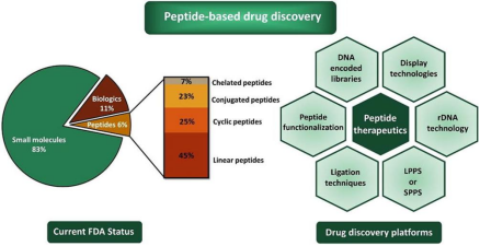 FDA批準的藥物可大致分為小分子、大分子(生物制劑)和肽(中等大小的藥物)。在所有FDA批準的藥物中,6%是肽,而83%和11%分別是小分子和生物制劑(圖1)。