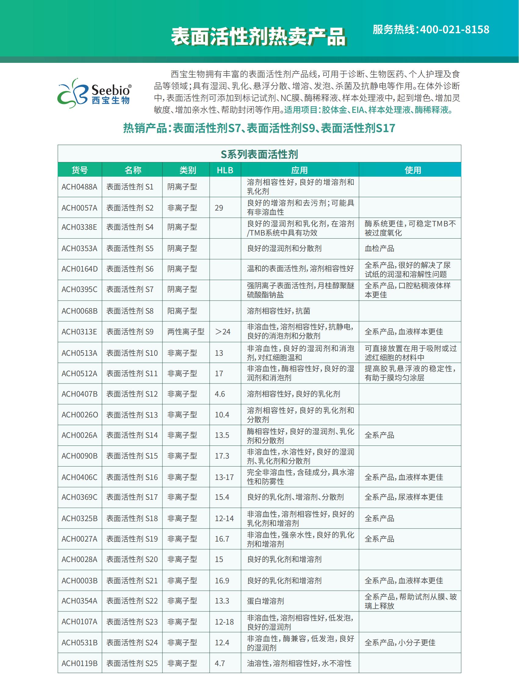西寶生物擁有豐富的表面活性劑產(chǎn)品線,可用于體外診斷、生物制藥、醫(yī)美日化等領(lǐng)域;具有濕潤(rùn)、乳化、懸浮分散、增溶、發(fā)泡、殺菌及抗靜電等作用。在體外診斷中, 表面活性劑可添加到標(biāo)記試劑、NC膜、酶稀釋液、樣本處理液中,起到增色、增加靈敏度、增加親水性、幫助封閉等作用。適用項(xiàng)目:膠體金、EIA、樣本處理液、酶稀釋液。
