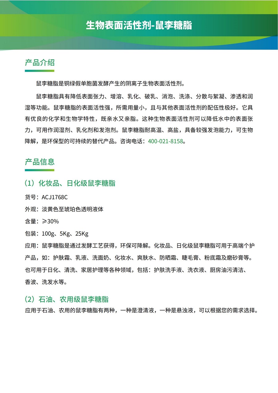 鼠李糖脂具有降低表面張力、增溶、乳化、破乳、消泡、洗滌、分散與絮凝、滲透和潤(rùn)濕等功能。鼠李糖脂的表面活性強(qiáng),所需用量小,且與其他表面活性劑的配伍性極好。它具有優(yōu)良的化學(xué)和生物學(xué)特性,既親水又親脂。這種生物表面活性劑可以降低水中的表面張力,可用作潤(rùn)濕劑、乳化劑和發(fā)泡劑。鼠李糖脂耐高溫、高鹽,具備較強(qiáng)發(fā)泡能力,可生物降解,是環(huán)保型的可持續(xù)的替代產(chǎn)品。咨詢電話:400-021-8158。