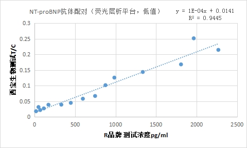 低值部分(≤2500pg/ml)與R品牌 NT-proBNP試劑相關(guān)性R2>0.94。