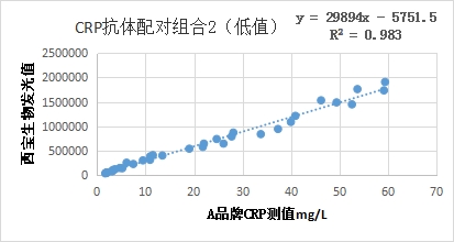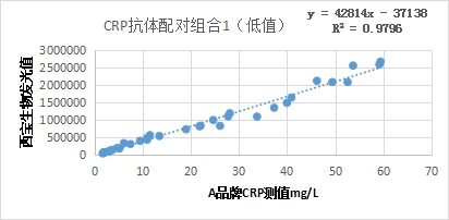 低值部分(≤60mg/L)與A品牌CRP試劑相關(guān)性R2>0.95。