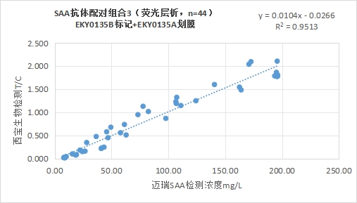 西寶生物熒光平臺(tái)SAA抗體配對(duì)組合3與邁瑞醫(yī)療SAA試劑(免疫比濁法)試劑賦值的臨床樣本相關(guān)性R2在0.95左右,相關(guān)性良好。