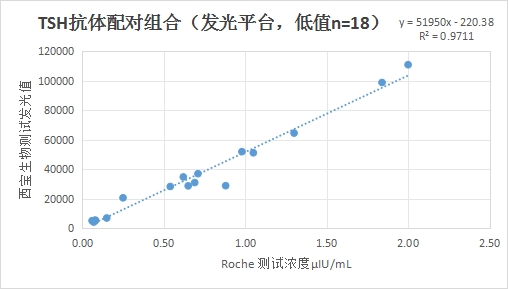 西寶TSH抗體配對低值部分(≤2μIU/mL) 的發(fā)光值與Roche TSH試劑臨床相關(guān)性R2>0.95;