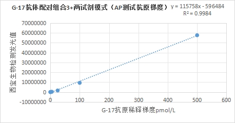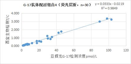西寶生物熒光平臺G-17抗體配對組合4與亞輝龍G-17試劑(化學(xué)發(fā)光法)賦值的臨床樣本相關(guān)性R2>0.95,相關(guān)性良好;