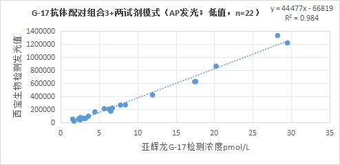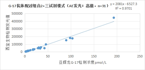 西寶生物發(fā)光(AE)平臺G-17抗體配對組合2(三試劑模式)與亞輝龍G-17試劑(化學(xué)發(fā)光法)賦值的臨床樣本相關(guān)性R2>0.95,相關(guān)性良好。